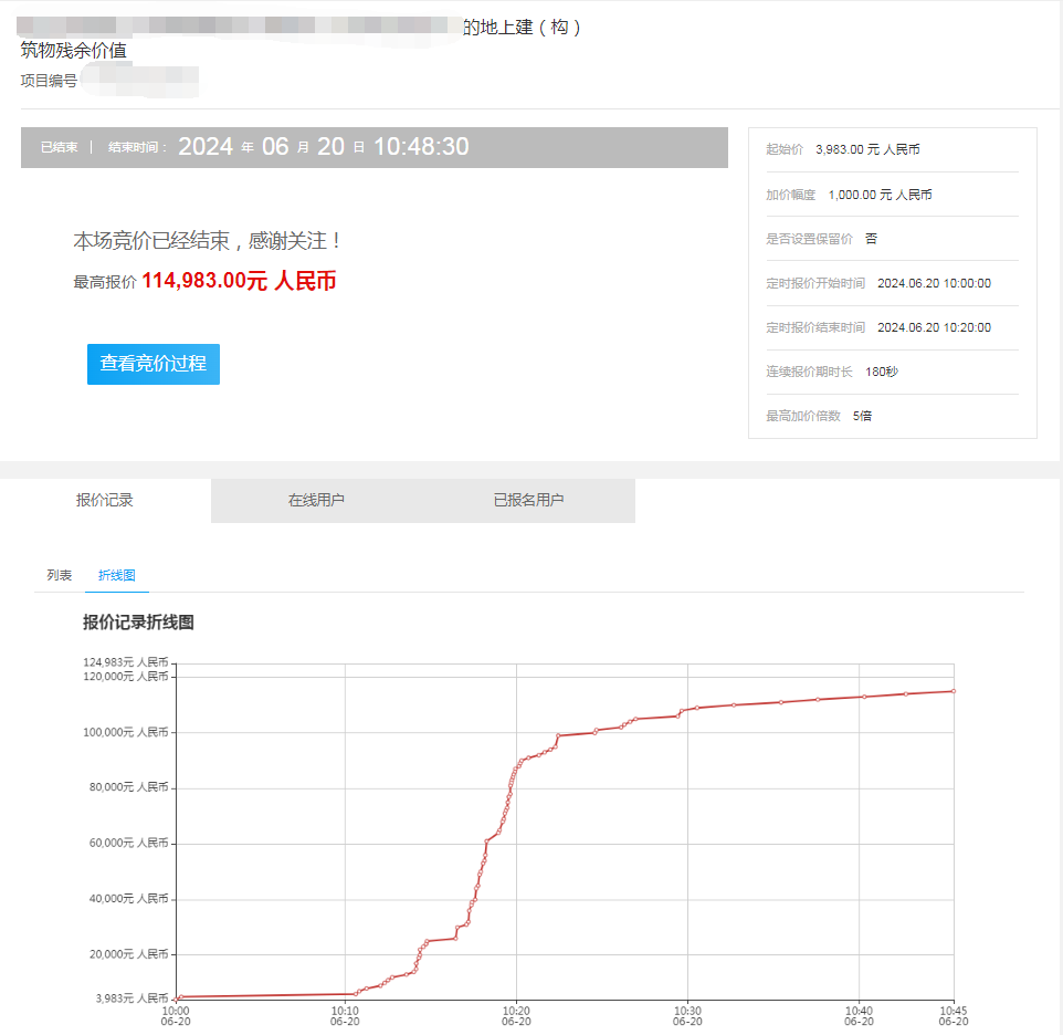 2024年我市某资产管理公司委托佛山南方产权处置一处地上建筑物拆除残值,本次处置以资产价值扣除拆除预估费用后评估定价,挂牌底价约0.39万元,经过76轮报价,最终以11.49万元成交,溢价11.10万元,增值率为2786.84%。