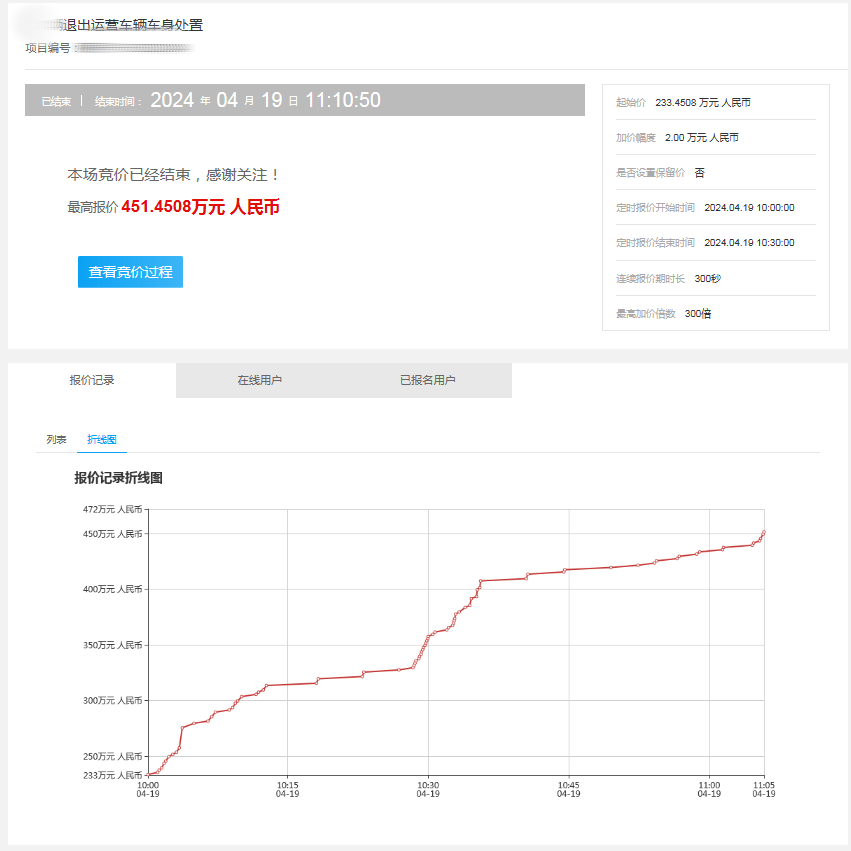 2024年我市某交通运输企业委托佛山南方产权处置一批废旧车辆车身,以废旧车辆车身残值评估定价,挂牌底价约233.45万元,经过81轮报价,最终以451.45万元成交,溢价218万元,增值率为93.56%。
